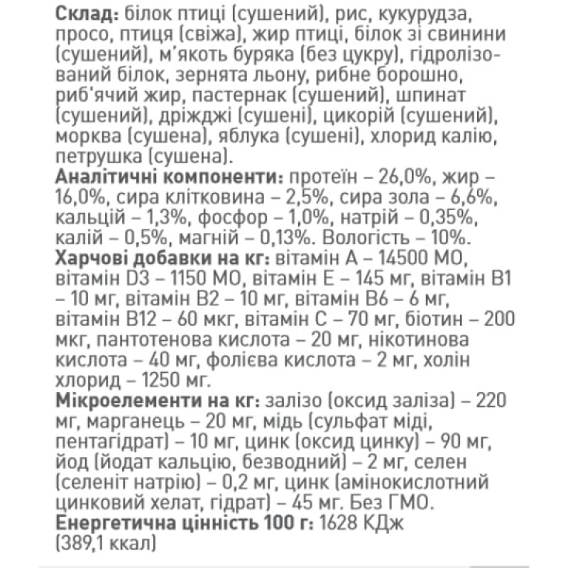 - Сбалансированный состав не требует дополнительного приема БАДов и витаминных комплексов. Благодаря экстракту новозеландского моллюска и порошку из мидий корм способствует укреплению опорно-двигательной системы животного