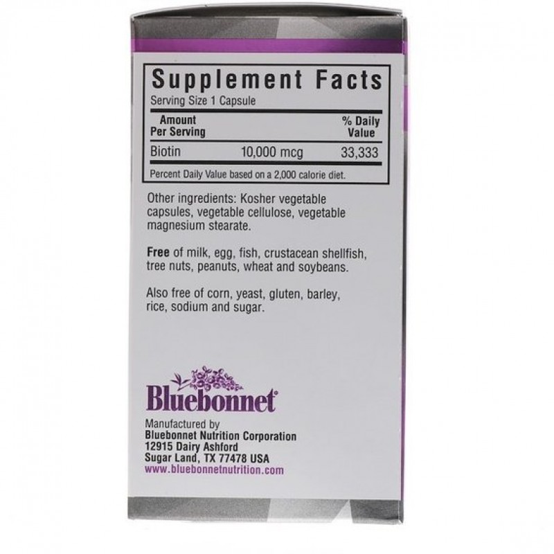 Прекрасный союзник Bluebonnet биотин 10 000 мкг капсулы содержат дрожжевой биотин в чистейшей кристаллической форме. Биотин, часто называемый питательным веществом красоты для молодого сияния, является водорастворимым витамином группы В, который обеспечивает поддержку здоровых волос и крепких, прочных ногтей.