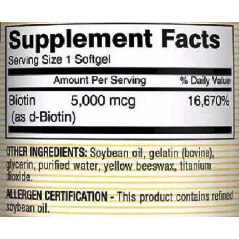 Биотин (D-биотин) — 5000 мкг. Другие ингредиенты: соевое масло, бычий желатин, глицерин, очищенная вода, пчелиный воск, двуокись титана. Не содержит сахара, крахмала, дрожжи, яиц, молочных продуктов, искусственных ароматизаторов и искусственных красителей.