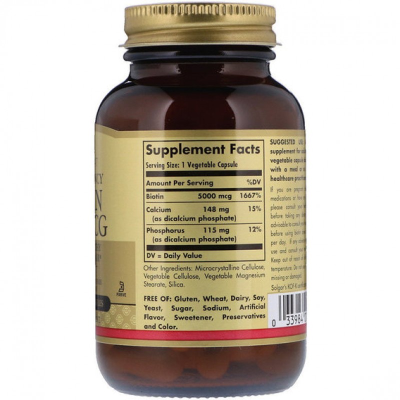 Предупреждения: Если вы беременны, кормите грудью, принимаете какие-либо лекарства или имеете какое-либо заболевание, проконсультируйтесь с вашим лечащим врачом, прежде чем принимать какие-либо пищевые добавки. Рекомендуется проконсультироваться с врачом, прежде чем использовать дозы биотина выше 2500 мкг в день. Если возникнут какие-либо побочные реакции, прекратите использование и проконсультируйтесь с врачом. Храните в недоступном для детей месте. Хранить при комнатной температуре.
