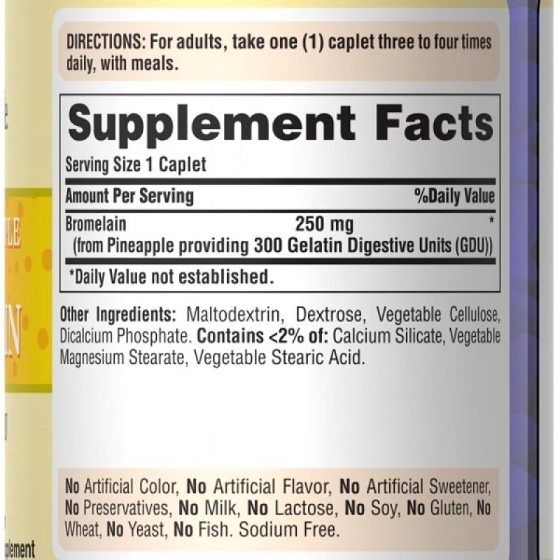 Puritan's Pride Bromelain 250 mg - натуральная пищевая добавка на основе бромелайна, полученного из стеблей ананаса, который является естественным пищеварительным ферментом. Изучение бромелайна, фермента, получаемого из ананаса, показывает, что он может усиливать нормальную реакцию иммунной системы, способствует перевариванию белков. При приеме во время еды бромелаин может способствовать улучшению пищеварения. Также Бромелайн может снимать неприятные ощущения в мышцах и суставах.