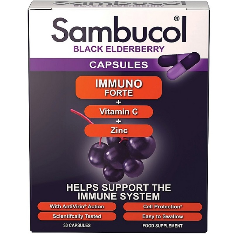 Ягоды бузины выводят из организма радионуклиды, соли тяжелых металлов. Чёрная бузина имеет стойкое иммуномодулирующее действие. Сок бузины обладает антибактериальными, противовирусными, антидепрессантов, противоопухолевые и гипогликемические свойствами. Витамин С и цинк также очень важны для иммунной системы, они нужен для бесперебойной ее работы. Капсулы Sambucol рекомендуется принимать на протяжении всего года, для бесперебойной поддержки иммунной системы, особенно в осенне-зимний период, когда возрастает заболеваемость на простуду и грипп.