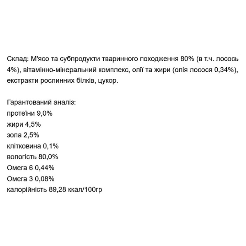 Сочные кусочки лосося обеспечивают кошку высококачественным белком, который легко усваивается. Влажный корм Carpathian Pet Food содержит 80% белков животного происхождения. Повышенное содержание витаминов (A, D3, E) и минералов (йод, железо, марганец) значительно укрепляет иммунитет кошки. Omega 3, Omega 6 и цинк положительно влияют на кожу и шерсть животного. Содержимое таурина способствует нормальному пищеварению, улучшает зрение, нормализует сердечную мышцу.