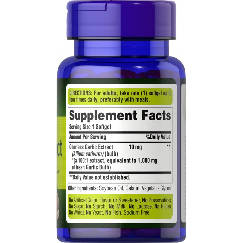 Чесночное масло, Garlic Oil, Puritan's Pride - это пищевая добавка, которая содержит концентрат чеснока, действие которого сравнимо с антибиотиками широкого спектра действия, так как он способствует повышению сопротивляемости организма к различным инфекционным заболеваниям. Натуральные ингредиенты чеснока включают аллиин, аллиназу и аллицин. Чеснок имеет традиционное применение, в том числе способствует поддержке здоровья сердца и сердечно-сосудистой системы, здорового кровотока и улучшения кровообращения. Масло чеснока богато витаминами и минералами, содержит большое количество против паразитарных веществ. Чеснок изобилует природными соединениями серы, аминокислотами и микроэлементами. Чесночное масло используют для повышения иммунитета, при простуде, гриппе, ангине, астме. Оно положительно действует на желудочно-кишечный тракт, активизирует аппетит, работу желудка и кишечника, применяется при дисбактериозе, гастрите, при запорах, глистах, гепатите. Чесночное масло назначают при головных болях, при кожных заболеваний, при цистите, мочекаменном заболевании и т.д.