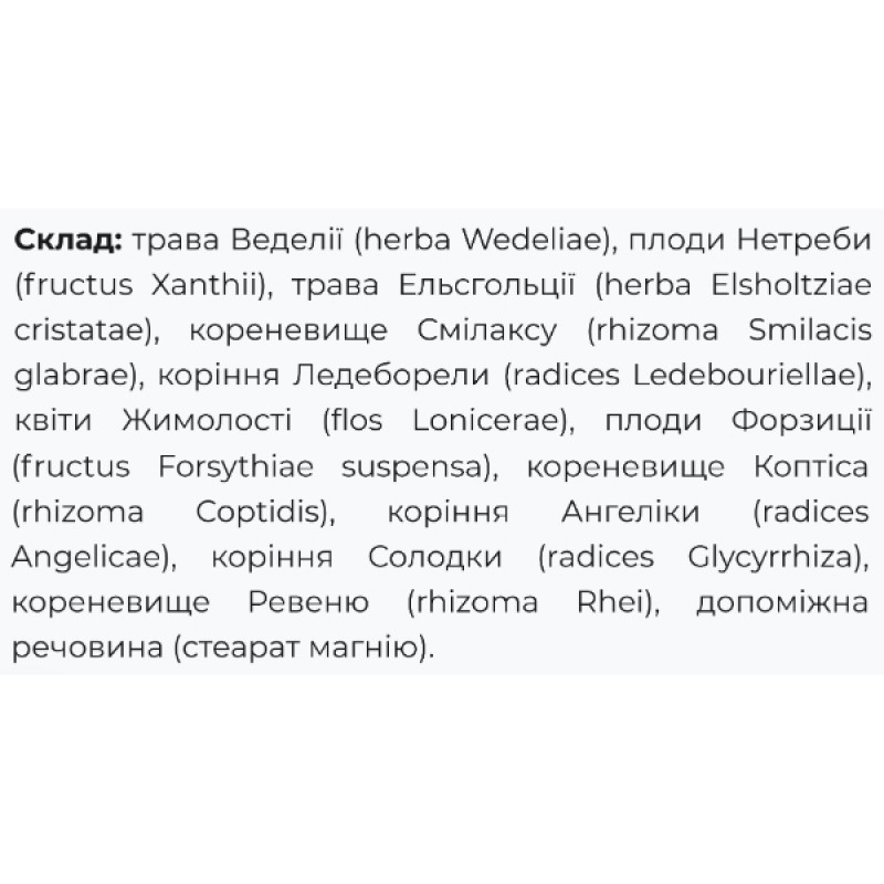 Веделия и Эльсгольция способствуют очищению организма от остаточных продуктов метаболизма, а Смилакс и Жимолость выводят вредные токсические вещества, которые попадают в организм из окружающей среды (соли тяжелых металлов, радионуклиды).