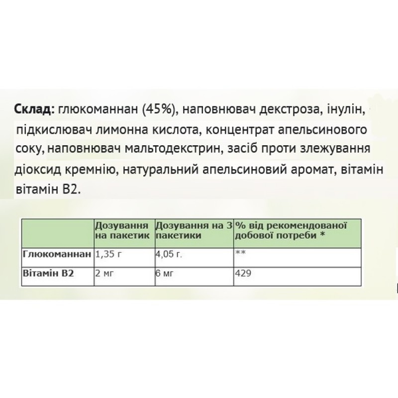 Рекомендация относительно употребления: 3 раза на день примерно за 30 минут до еды, размешайте содержимое пакетика в стакане воды (200 мл) и быстро выпейте. Продукт может образовывать гелеподобную структуру из-за сильной отекающей способности. Позже выпейте еще стакан воды.