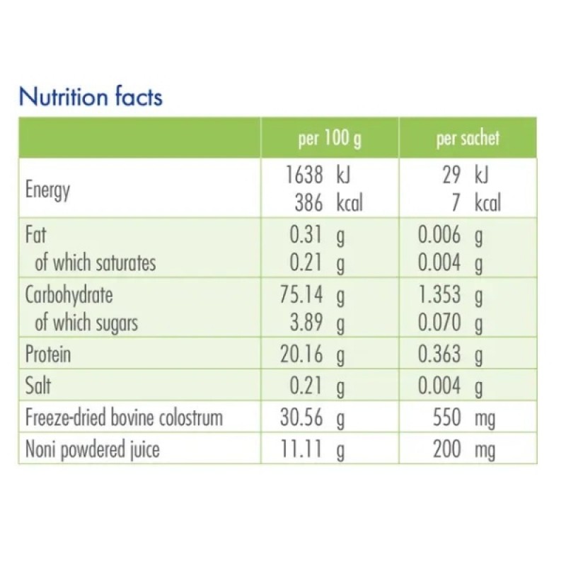Эффективное средство, благодаря уникальной синергии высокой дозы обезжиренного лиофилизированного пастеризованного коровьего молозива, и экстракта сока фрукта Нони (Morinda citrifolia L.). Синергия активных ингредиентов помогает: