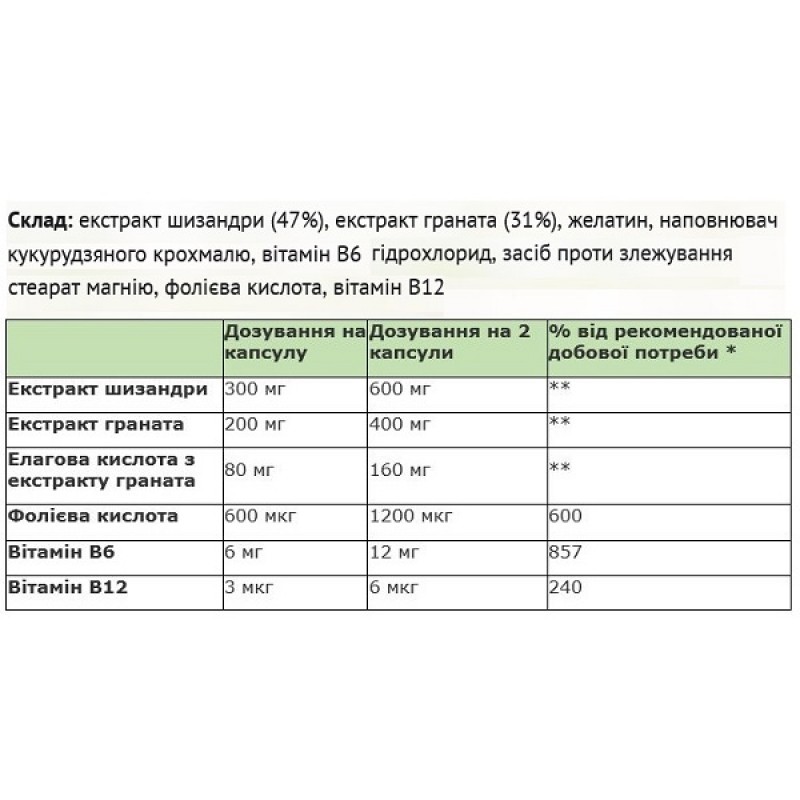 Комбинация трех витаминов В-группы (В6, В9, В12) синергично действуют на уменьшение показателей гомоцистеина - маркера воспалительных процессов. Это аминокислота, которая образуется в процессе распада метионина в цикле метилювання. Витамины участвуют в синтезе эритроцитов, сообща с экстрактом гранатом повышают уровень гемоглобина и препятствуют появлению анемии.