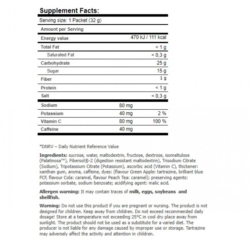 - высококачественные углеводы, т. е. палатиноза, мальтодекстрин и декстроза - гарантируют постоянную инъекцию энергии, до 4 часов,