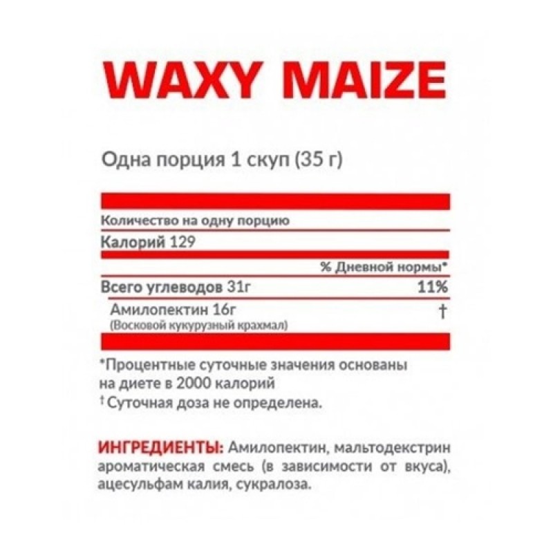 Порцию-35 грамм (1 скуп) продукта размешать с 300 мл воды, молока или другой жидкости. Принимать коктейль 3 раза в дня между основными приемами пищи. В тренировочные дни рекомендуется употреблять порцию Waxy Maize после тренировки.
