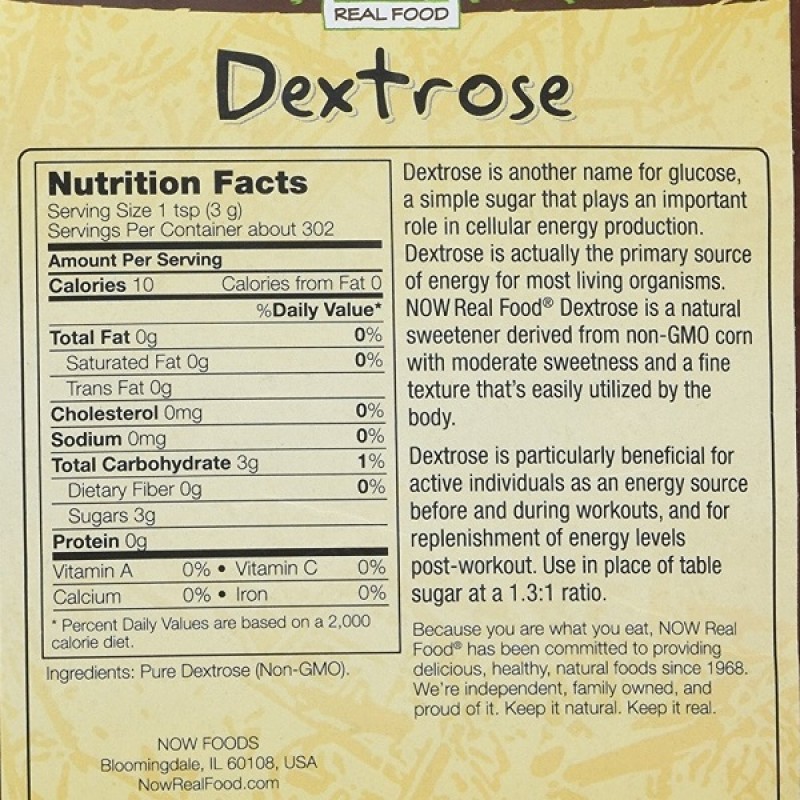 Декстроза NOW Foods, Real Food "Dextrose" - это природный моносахарид, который является изомером молекулы глюкозы. Это белый кристаллический порошок, который хорошо растворяется в воде. На упаковке продуктов, содержащих эту пищевую добавку, производители так же могут указывать ее под названиями глюкоза и виноградный сахар.