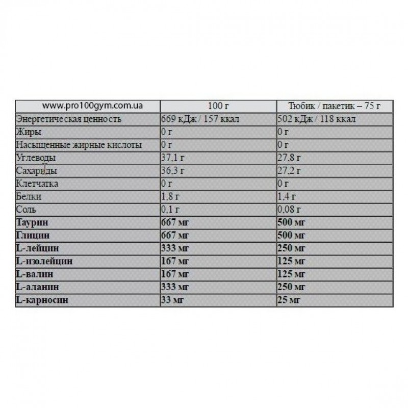 Такое сочетание компонентов обеспечит максимальную энергию на протяжение всей тренировки, вам всего лишь нужно проглотить продукт и уже в течение нескольких минут он быстро усвоится, не вызывая никаких желудочно-кишечных затруднений. Гель не содержит минералов и вы можете его сочетать с любым спортивным напитком во время тренировки.