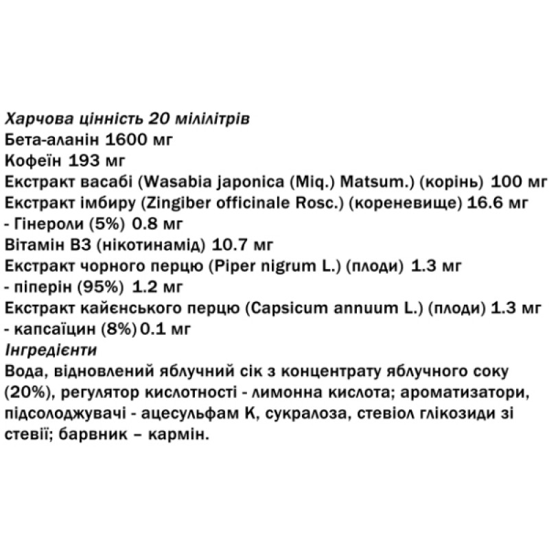Это продукт, который позволит вам почувствовать себя настоящим профессионалом! С одной стороны, вы получаете комплекс натуральных растительных экстрактов (васаби, имбиря, черного перца и кайенского перца). С другой стороны, использовалась комбинация ингредиентов, влияющих на работу нервной системы. Речь идет о широко известных кофеине и бета-аланине, повышающих выносливость на фоне нарастающей усталости. Все это дополняется порцией ниацина, который не только поддерживает энергетический обмен, но и снижает чувство усталости.