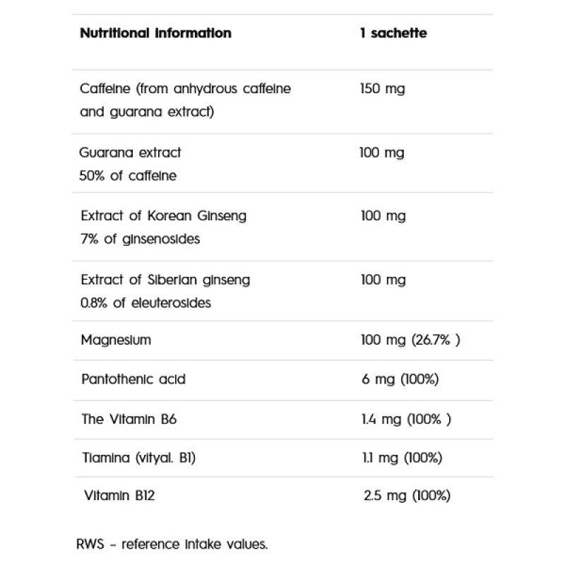 Olimp Drinks for life Energy – пищевая добавка в форме порошка, которая моментально заполнит ваши разоренные энергетические баки, чтобы вы могли дальше заниматься работой по построению своего тела. Отличное решение не только для спортсменов, но и просто физически активных людей. Содержит сахар и подсластители. Продукт, содержащий высокую порцию кофеина (150 мг/1 пакетик), стандартизированы экстракты двух видов женьшеня: сибирского и корейского, магний и витамины группы В (пантотеновая кислота, витамин В6, тиамин, витамин В12).