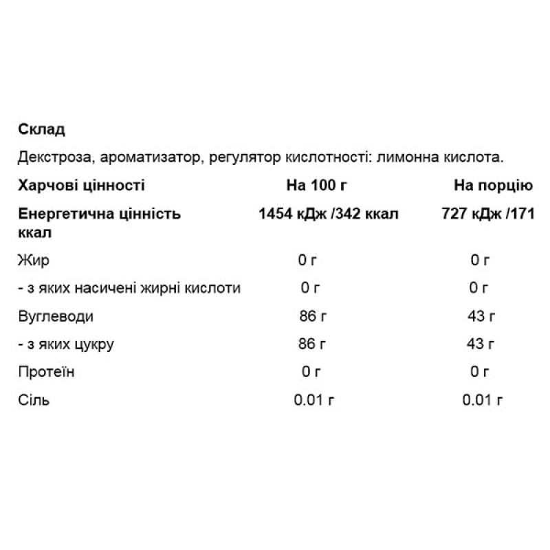 Быстрое восстановление энергии: Декстроза быстро усваивается организмом, обеспечивая мгновенный приток энергии, что особенно важно во время и после интенсивных тренировок.
