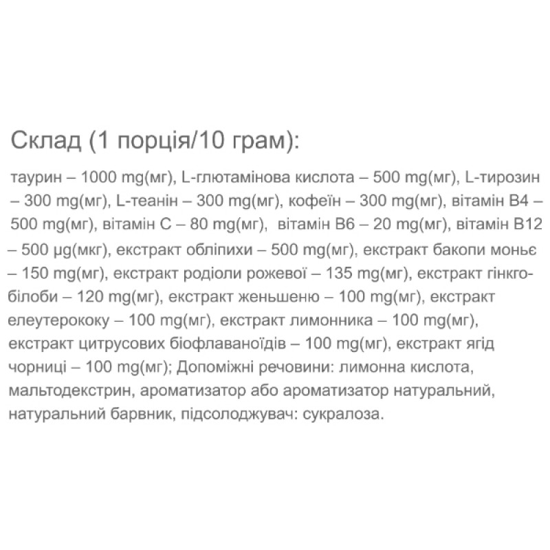 Таурин способствует повышению энергетического уровня и улучшению физической выносливости. L-глутаминовая кислота и L-тирозин поддерживают здоровье нервной системы и функционирование мозга, помогают улучшить настроение. L-теанин способствует снижению уровня стресса и улучшает фокус внимания. Кофеин стимулирует центральную нервную систему, повышая бодрость и стимулируя работу нейронов в нашем мозге. Витамины В4, В6, В12 важны для энергетического обмена и поддержания здоровья нервной системы.