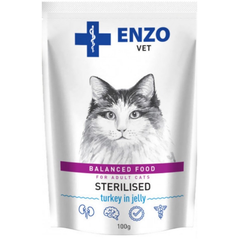 ENZO VET BALANCED FOOD TURKEY IN JELLY - влажный корм с мясом индейки для стерилизованных кошек, живущих в помещении.