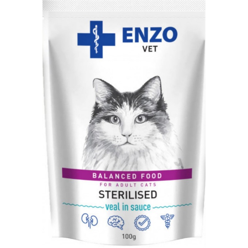 ENZO VET BALANCED FOOD VEAL IN SAUCE - влажный корм с мясом телятины в соусе для стерилизованных кошек, живущих в помещении.