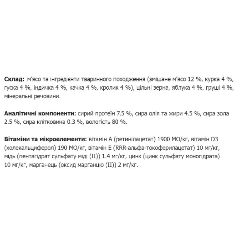 Он состоит из мягких, сочных кусочков разного мяса: курицы, гуся, индейки, утки и кролика. Гусь и кролик являются источником высококачественного белка и богаты витаминами В3, В12, селеном и фосфором. Селен действует как природный антиоксидант и может помочь предотвратить некоторые заболевания, связанные с кожей, костями и выносливостью. Утка и индейка - вкусные и легкоусвояемые белки. Яблоки являются хорошим источником витаминов А, С и пищевых волокон. Груша является хорошим источником витаминов А, С, Е, В и различных минералов, таких как фосфор, калий и медь.