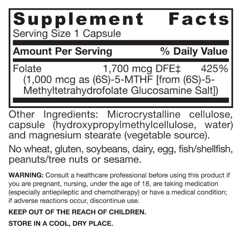 Метил фолиевая кислота (Methyl Folate) 1000 мкг способствует здоровой сердечно-сосудистой функции и нормальному делению клеток. Фолиевая кислота является витамином группы В и важным питательным веществом для здоровья сердца и нормального развития плода. Фолиевая кислота - это донор метила, необходимый для превращения гомоцистеина обратно в метионин и для точного синтеза ДНК и нормального деления клеток на протяжении всей жизни, в том числе во время беременности.