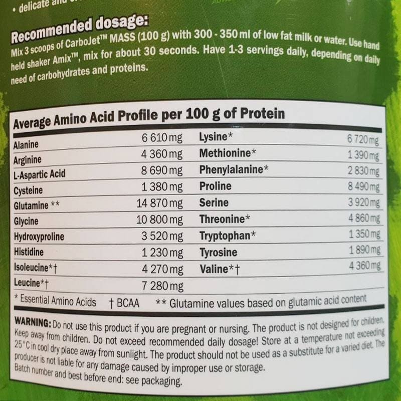 Amix TM CarboJet TM MASS - это специально разработанный углеводно-протеиновый гейнер, обогащенный высококачественными аминокислотами в свободной форме (BCAA и L-глутамин), L-цитруллином, бета-аланином и огромной дозой креатинового комплекса.