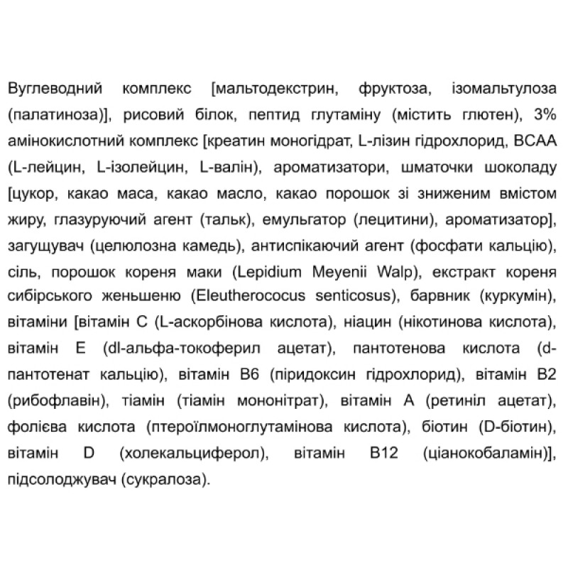 - Смесь из трех типов углеводов (фруктоза, палатиноза и мальтодекстрин) обеспечивает длительный и стабильный источник энергии, необходимый для интенсивных тренировок и восстановления.
