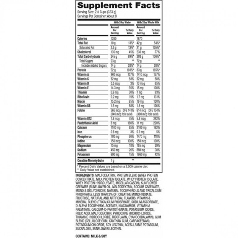 Dymatize Super MASS Gainer содержит так же креатин моногидрат, который повышает выносливость и силовые показатели. Дополнительная порция аминокислот ВСАА увеличивает антикатаболическую ценность гейнера. Кроме того, SUPER MASS GAINER обогащен витаминно-минеральным комплексом, т.е.продукт является очень экономичным,фактически все необходимые для роста и силы элементы собраны в одной упаковке! Вам не нужно покупать различные препараты по отдельности и думать,когда и как принимать каждый из них, можно просто принимать SUPER MASS GAINER и быстро набирать массу!