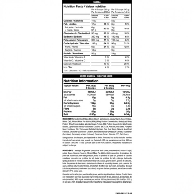 Каждая порция содержит 56 грамм протеиновой матрицы Mutant Mass Pro-Matrix. Уникальная протеиновая матрица снабжает организм 6 видами белка, которые обеспечивают, пролонгированое поступление аминокислот! Когда вы сочетаете мощную протеиновую матрицу с другими ключевыми анаболическими ингредиентами содержащимися в MUTANT MASS, вы получаете непревзойденную формулу для быстрого набора массы!