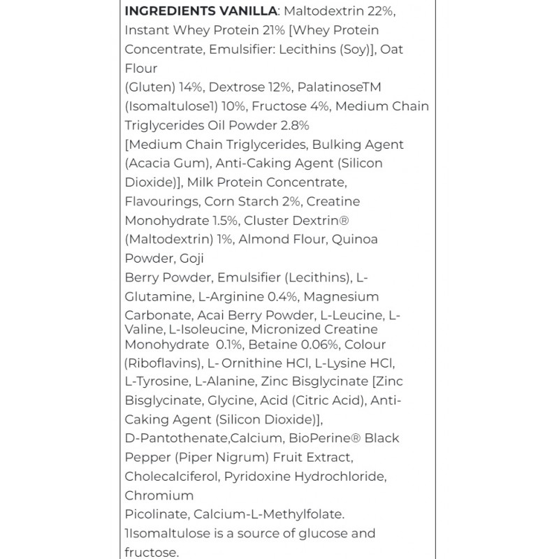 Состав препарата: мальтодекстрин 22%, быстрорастворимый концентрат сывороточного протеина 21%, овсяная мука (глютен) 14%, декстроза 12%, палатиноза (изомальтулоза) 10%, фруктоза 4%, какао-порошок с пониженным содержанием жира, масляный порошок триглицеридов со средней цепью 2,8% [Триглицериды средней цепи, наполнитель (камедь акасаи), противослеживающий агент (диоксид кремния)], концентрат молочного белка, ароматизаторы, кукурузный крахмал 2%, моногидрат креатина 1,5%, кластерный декстрин (мальтодекстрин) 1%, миндальная мука, порошок киноа , порошок ягод годжи, эмульгатор (лецитины), L-глютамин, L-аргинин 0,4%, карбонат магния, порошок ягод асаи, L-лейцин, L-валин, L-изолейцин, микронизированный моногидрат креатина 0,1%, бетаин 0,06%, L -орнитин гидрохлорид, L-лизин гидрохлорид, L-тирозин, L-аланин, бисглицинат цинка [бисглицинат цинка, глицин, кислота (лимонная кислота), антислеживающий агент (диоксид кремния)], D-пантотенат, кальций-L-метилфолат . Изомаитулоза является источником глюкозы и фруктозы.