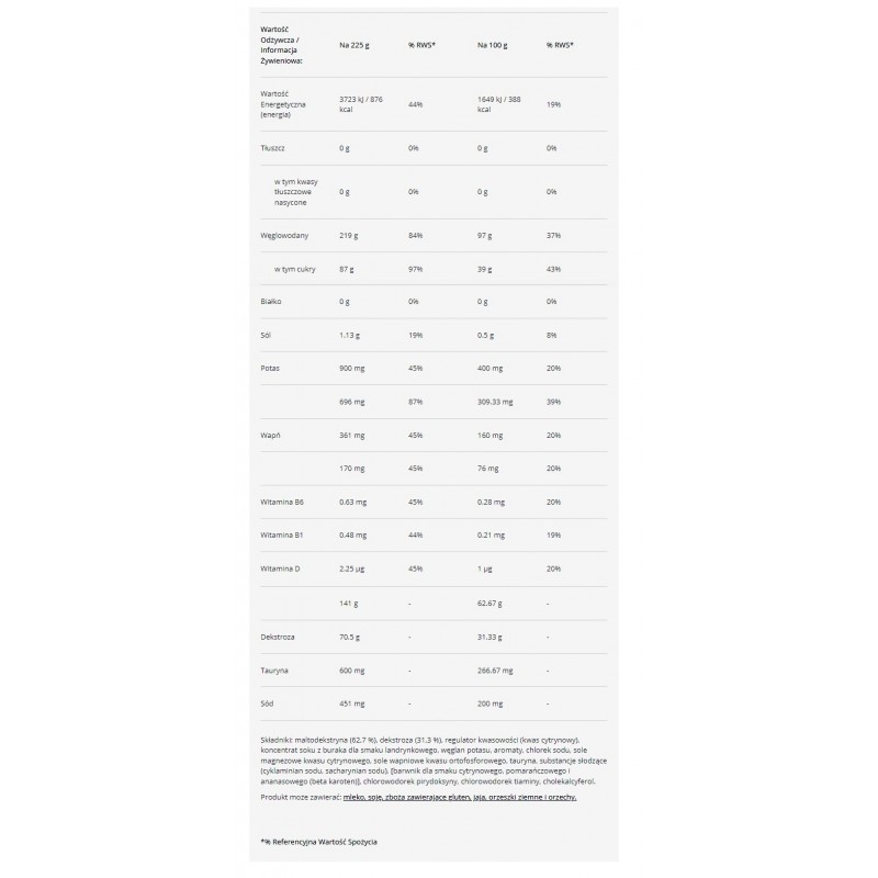 CARBO SPORT представляет собой прекрасно растворимый комплекс различных углеводов: олиго- и полисахаридов и декстрозы, обогащенный электролитными элементами, витаминами и таурином. Магний и витамин B6 способствуют уменьшению усталости. Кроме того, витамин D помогает в правильном функционировании мышц, а тиамин способствует поддержанию правильного энергетического обмена.