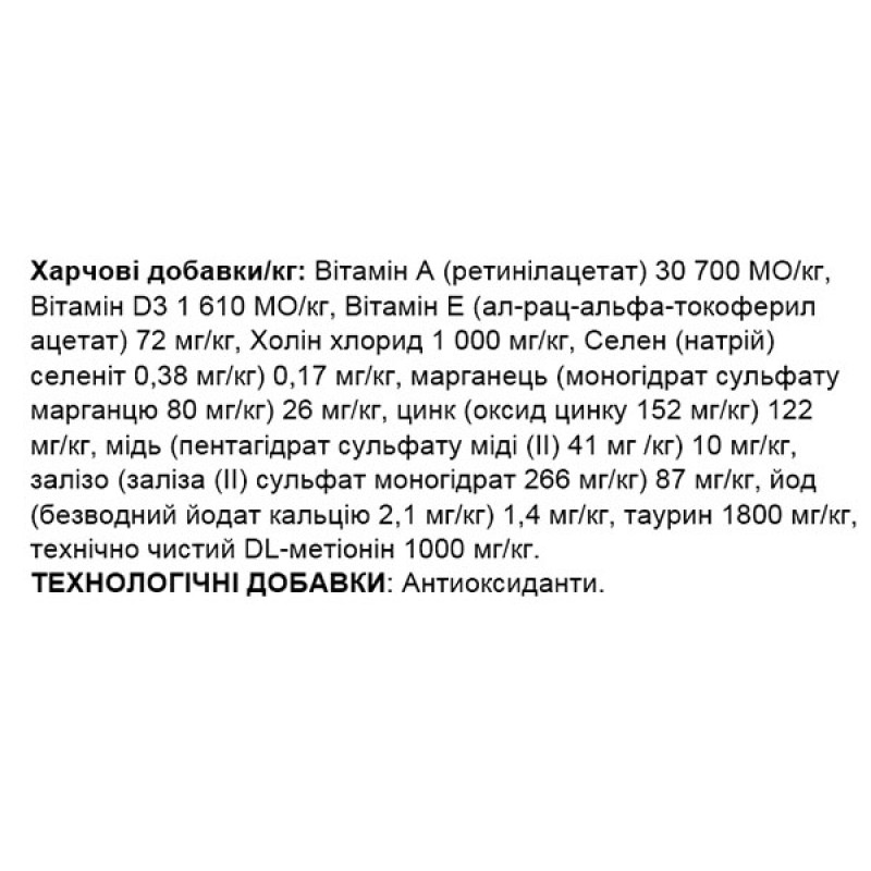 - Содержит таурин и L-карнитин – аминокислоты, отвечающие за переваривание жиров, сохранение острого зрения, здоровье сердца и нервные ткани любимца.