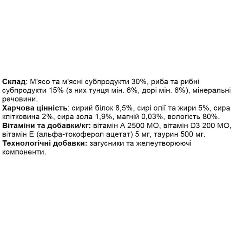 - Ароматное желе с кусочками рыбы – тунца и Дори создано с учетом потребностей в питании кастрированных кошек и стерилизованных кошек.