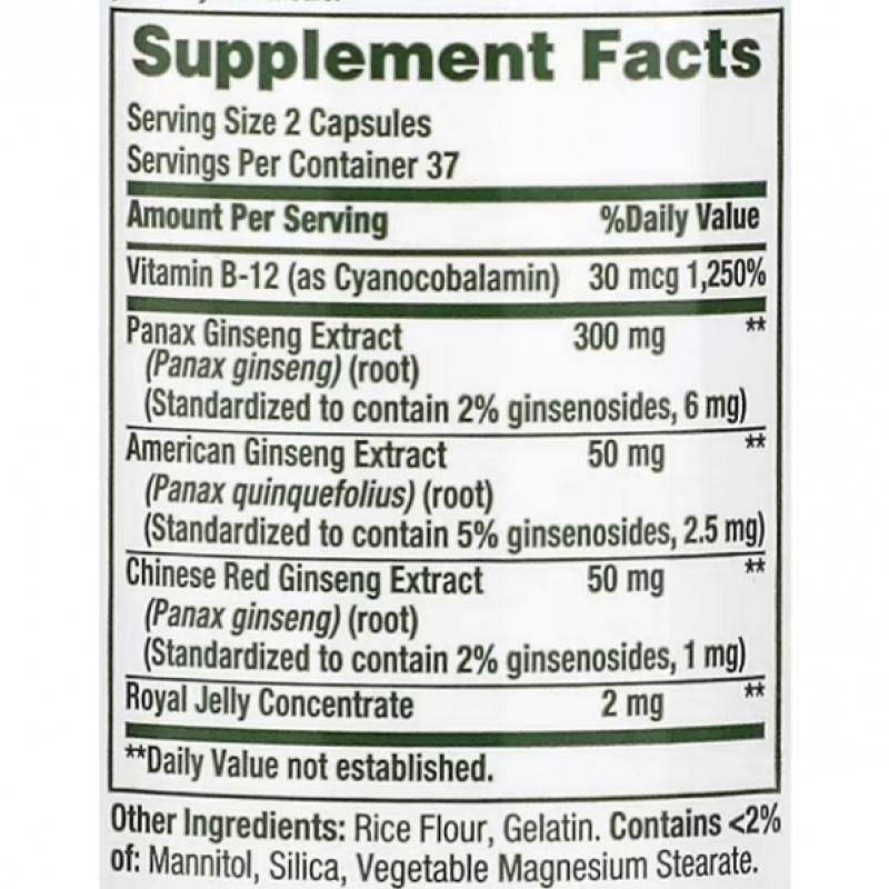 Женьшень – это многолетнее растение, которое знаменито с давних времен своими лечебными свойствами. Его корень содержит в себе алкалоиды, смолы, витамин С, серу и фосфор, и множество других полезных микроэлементов. Он классифицируется, как адаптоген. Данная добавка содержит три вида женьшеня: женьшень обыкновенный, американский и китайский красный.