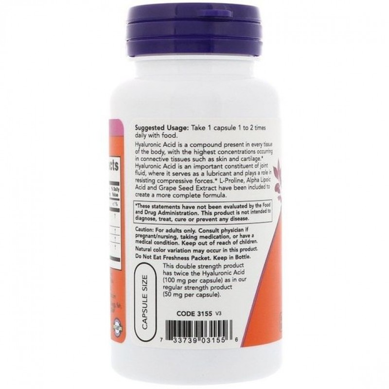 Этот продукт двойной прочности имеет дважды гиалуроновую кислоту (100 мг на капсулу), как в нашем обычном прочном продукте (50 мг на капсулу).