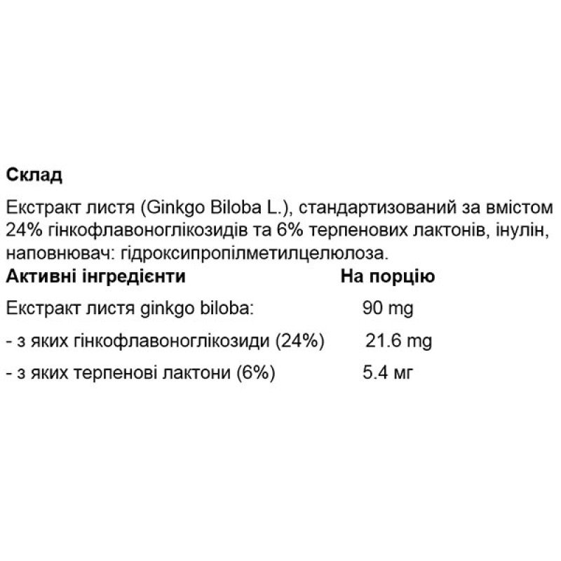 - Экстракт гинкго билоба, стандартизированный до 24% гинкофлавонгликозидов и 6% терпеновых лактонов.