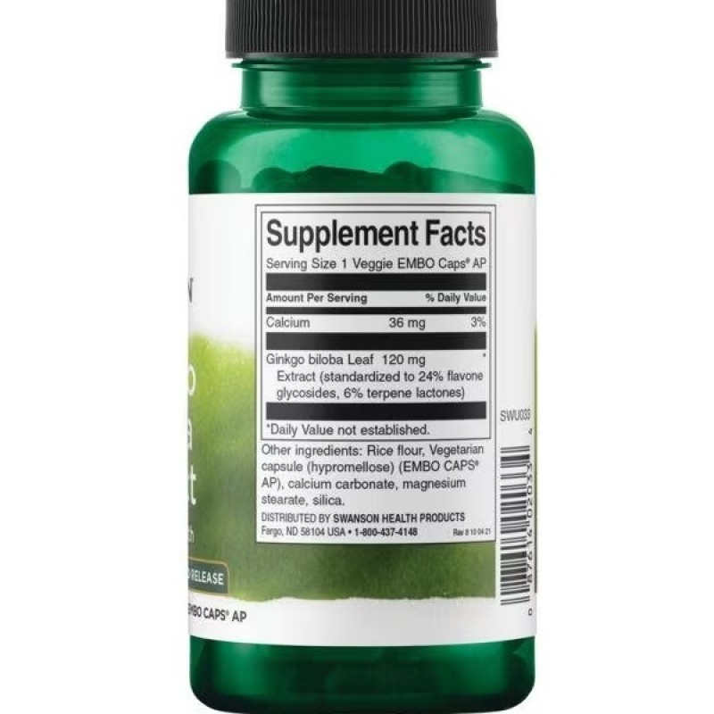 Гинкго Билоба, Ginkgo Biloba Extract, Swanson - продукт изготовлен из высококачественного, стандартизованного экстракта листьев дерева гинкго. Гинкго билоба также называют девичьим деревом, за активные ингредиенты, флавоновые гликозиды и терпеновые лактоны, содержащиеся в листьях растения. Еще с давних времен его использовали на Востоке, но больше всего в Китайской народной медицине, в качестве целительного средства, возвращавшего красоту и молодость. Гинкго билоба обладает антиоксидатными свойствами и способствует нейтрализации и выведению свободных радикалов. Оно не только эффективно для концентрации и расстройствах памяти, но и при нарушениях кровообращения, тревожном состоянии, недержании мочи. Гинкго билоба владеет антиоксидатными свойствами и способствует нейтрализации и выведения свободных радикалов. Наибольше гинкго известно своим действием на ткань мозга: улучшает кровообращение, когнитивные функции особенно у тех лиц, кто чувствует часто повторяют проблемы с мелким фокусом, связанных со старением (умственная ориентация, нарушение памяти). Гинкго билоба способствует нормализации кровообращения в конечностях (боль в ногах, вызванной закупоркой артерий), поддерживает микроциркуляцию сосудов мозга (устраняет головную боль, шум и звон в ушах, головокружение). Эффективность применения доказана при слабоумии, атеросклерозе.