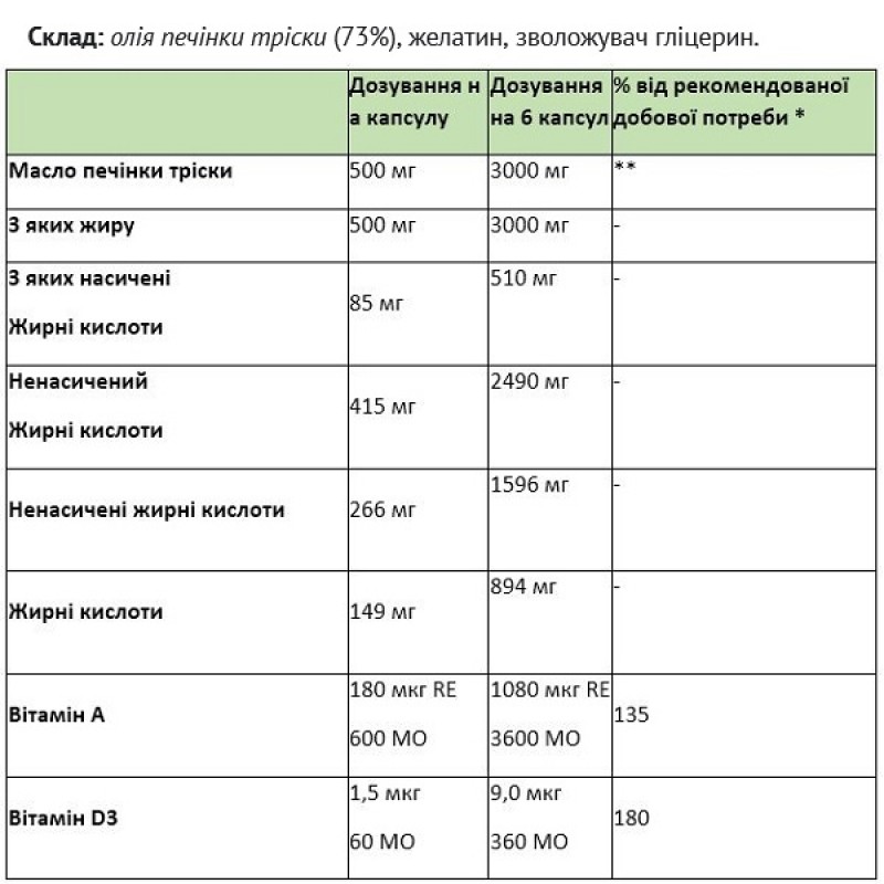 Жир печени трески содержит большое количество витамина А, витамина D и полиненасыщенные жирные кислоты. Способствует нормализации зрения и снижению риска развития катаракты, дегенерации сетчатки.
