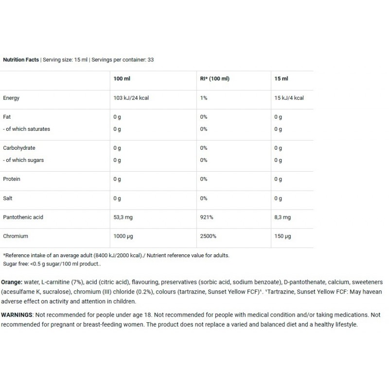 BiotechUSA L-Carnitine 35.000 mg + Chrome concentrate - L-карнитин с хромом в быстроусваивоемой жидкой форме. Хром способствует снижению уровня сахара в крови и как следсвие понижает апетит. L-карнитин способствует жиросжиганию и ускоряет метаболизм.