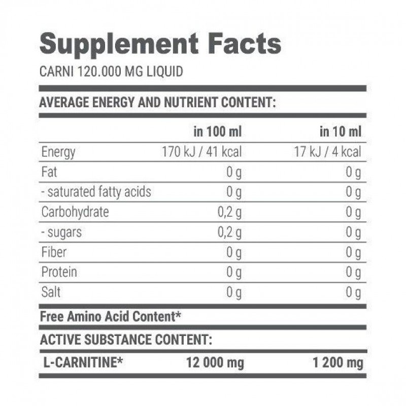 Carni Liquid 120000 в одной порции (10 мл) содержит 1200мг L-карнитина в чистом виде без лишних наполнителей. Основной функцией L-карнитина является, участие в транспорте жирных кислот в митохондрии, где происходит их преобразование в энергию. Также обеспечивает повышение метаболизма и усиленную выработки энергии организмом, за счет сжигания подкожного жира. Усиление липолиза позволяет превратить хранящейся жир на свободные жирные кислоты, которые легко используется организмом и удаляются.