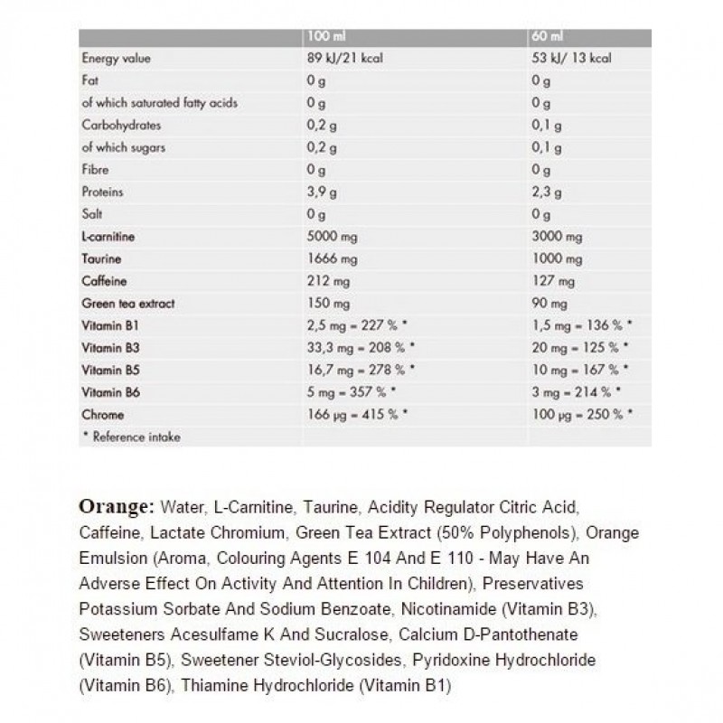 CARNITINE 3000 SHOT от NUTREND – это высококачественный карнитин для тех, кто регулярно тренируется и стремится сохранить прекрасную форму своего тела. Эффективная смесь активных ингредиентов содержит в каждой порции 3 г L-карнитина, а также таурин и хром (способствуют нормальному метаболизму макронутриентов), кофеин и экстракт зеленого чая (помогают контролировать вес), витамины В1, В3, В5, и В6 (уменьшают усталость и поддерживают энергообмен). CARNITINE 3000 SHOT помогает увеличить интенсивность тренировок и улучшает концентрацию. Также данный препарат может с успехом использоваться в качестве средства снижения лишнего веса.