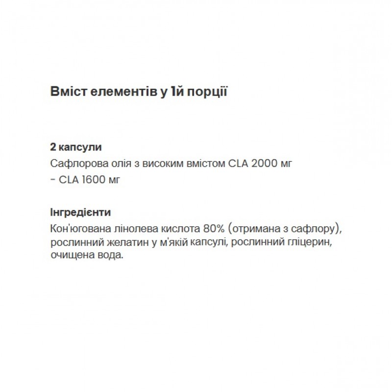 Конъюгированная линолевая кислота 80% (полученная из сафлора), растительный желатиновый гель, растительный глицерин, очищенная вода.