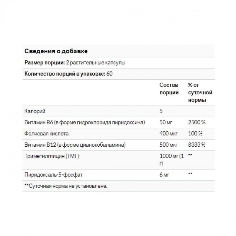 - Триметилглицин: 1000 мг