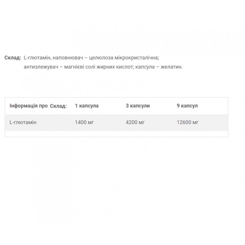 Всего в 1 капсуле, 1400мг этой почти основной аминокислоты, которая обладет очень мощным анаболическим действием. Наличие глютамина в мышечных клетках , является хорошим магнитом для остальных аминокислот.