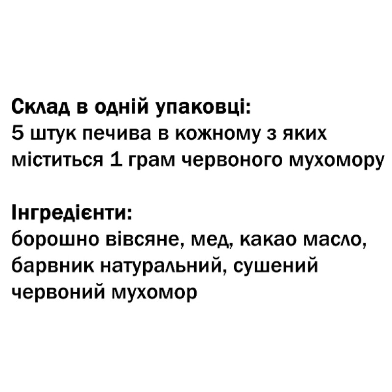 В упаковке 5 штук печенья, в каждом из которых содержится 1 грамм красного мухомора.