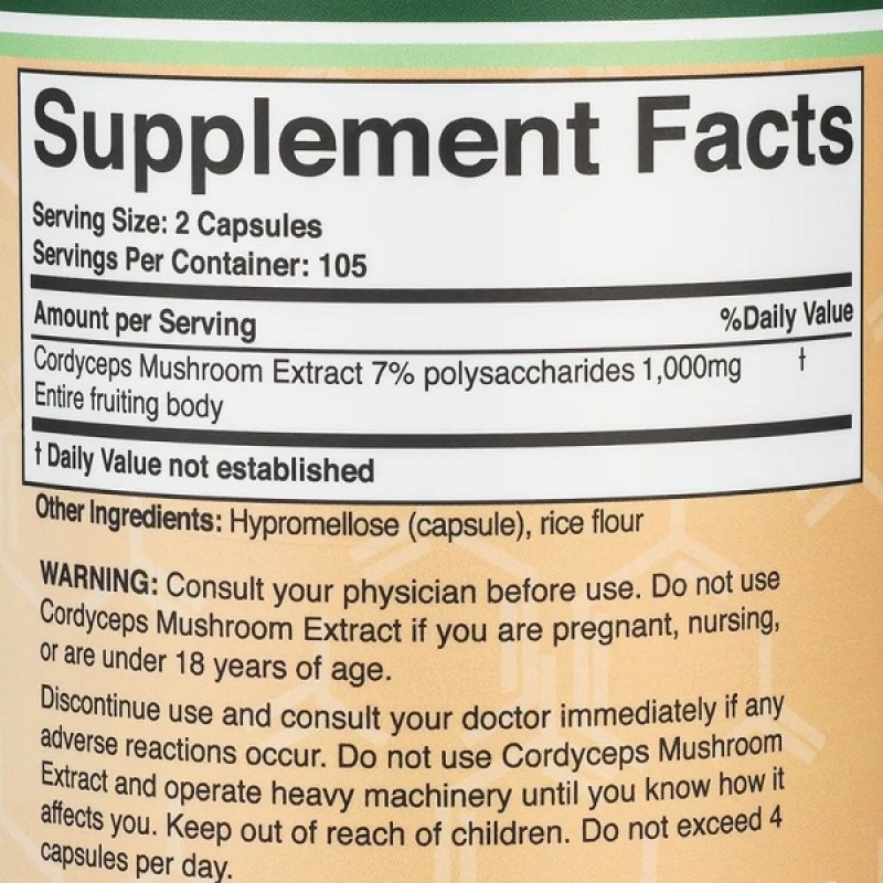 Double Wood Supplements Cordyceps Mushroom Extract 1000 mg - натуральная пищевая добавка на основе мицелия гриба кордицепс, который позитивно влияет на имунную и нервую системы.
