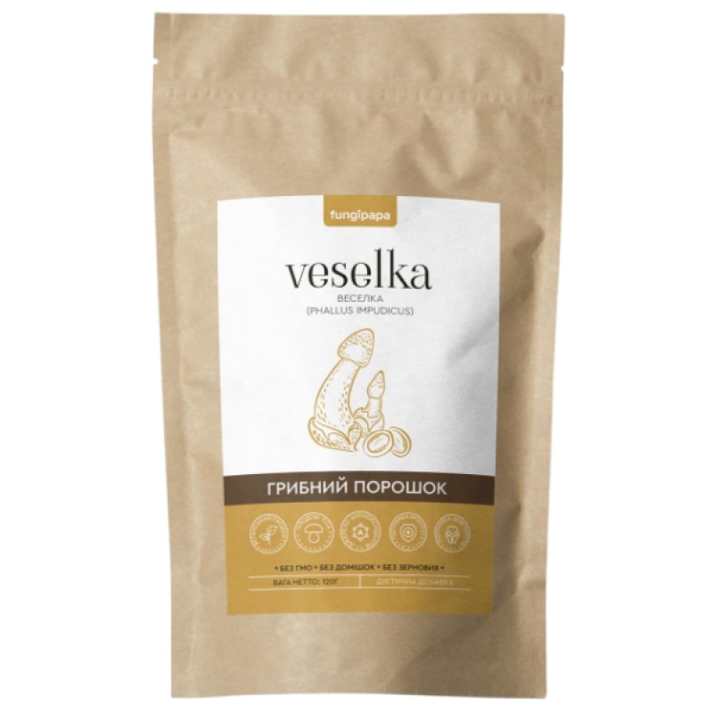 Веселка Fungipapa (Phallus impudicus) грибной порошок изготовлен из плодовых тел в состоянии «яйца», что является уникальной особенностью этого продукта. Именно в этой ранней фазе развития, плодовые тела гриба Веселка содержат наибольшую концентрацию активных биологических соединений, делая их особенно ценными для использования в изготовлении грибного порошка.