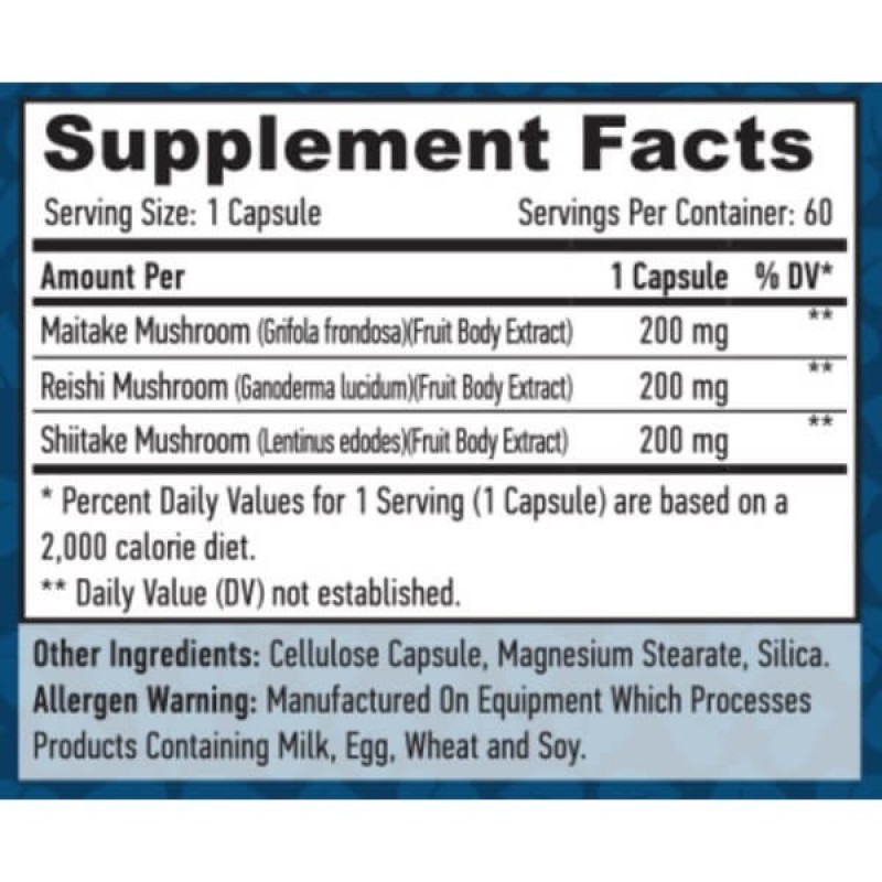 Triple Mushroom Complex от популярного американского бренда Haya Labs представляет собой уникальный натуральный комплекс из трех видов грибов, обладающих мощным позитивным воздействием на организм. Эти грибы – шиитаке, майтаке и рейши. В них содержится внушительный перечень витаминов, минералов, полисахаридов, аминокислот и других важных для здоровья нутриентов. При этом калорийность ингредиентов, а значит, и самой биоактивной добавки является минимальной.