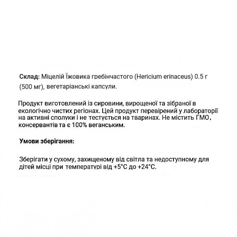 Продукт может быть использован как источник биологически активных соединений растительного происхождения. Мицелий Ежовика гребенчатого стимулирует синтез нервного ростового фактора, что может замедлить или уменьшить симптомы заболеваний, таких как болезнь Альцгеймера, болезнь Паркинсона, деменции. Профилактика и поддержка преждевременного старения организма, улучшение координации и зрения, противодействие воспалительным процессам в организме. Способствует регенерации нервных клеток после неврологических повреждений и инсульта. Улучшает когнитивные функции, память, внимание и увеличивает сосредоточенность и исполнительные функции мозга. Диетическая добавка обладает антидепрессивным и анксиолитическим эффектом, снижая симптомы тревожности и улучшая настроение. Антиоксиданты способствуют улучшению качества кожного и волосяного покрова, а также способствуют правильному обмену веществ и нормализации пищеварения. Полисахариды поддерживают работу иммунной системы и оказывают противовоспалительное воздействие на организм.