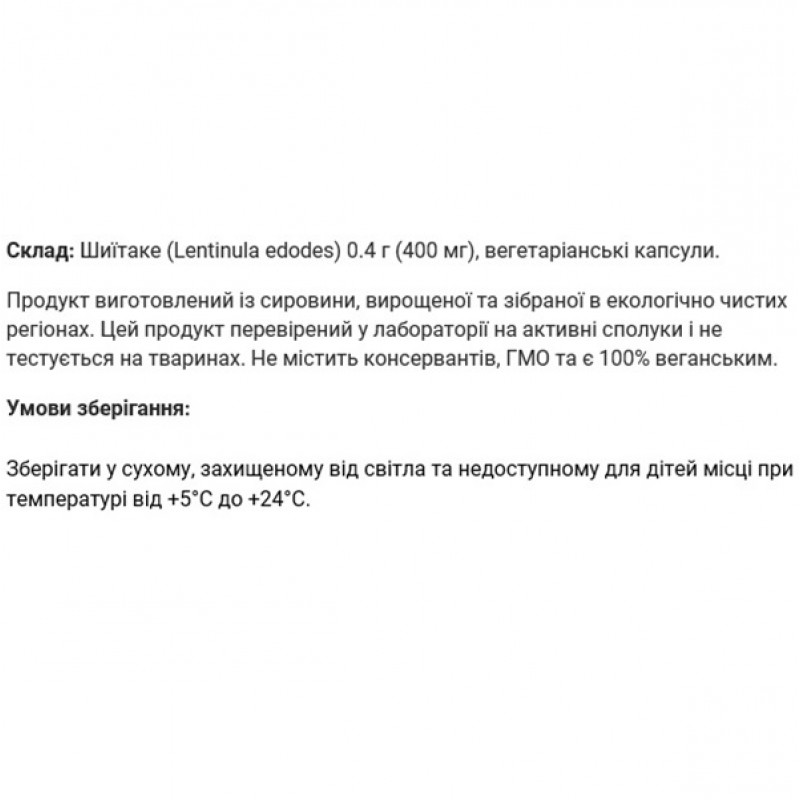 Продукт может быть использован как источник биологически активных соединений растительного происхождения. Диетическая добавка благодаря содержанию полисахаридов стимулирует работу иммунной системы, увеличивая активность макрофагов. Благодаря активным соединениям помогает уменьшить уровень системного воспаления в организме. Бета-глюканы способствуют здоровью кишечной микрофлоры и могут улучшить пищеварение. Высокое содержание антиоксидантов в Шиитаке помогает защитить клетки от повреждения свободными радикалами, замедляя процессы старения и снижая риск развития хронических заболеваний. Богатый набор витаминов и минералов способствует здоровью кожи, волос и ногтей, помогая уменьшить проявления старения и улучшить общее состояние. Эритаденин и бета-глюканы помогают снизить уровень холестерина в крови, что может способствовать профилактике атеросклероза и других сердечно-сосудистых заболеваний. Исследования указывают на то, что лентинан и другие компоненты добавки могут обладать противоопухолевой активностью, способствуя ингибированию роста раковых клеток.