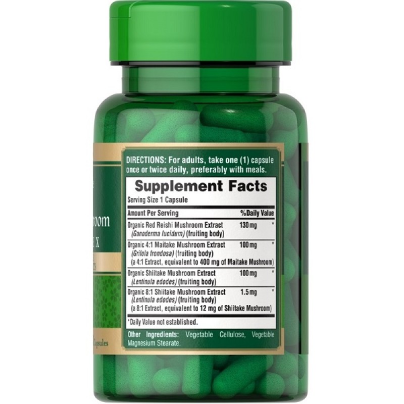 Лечебные грибы комплекс (Triple Mushroom Complex Reishi Shiitake Maitake) Puritan's Pride - это органическая смесь грибов рейши, шиитаке и майтаке.